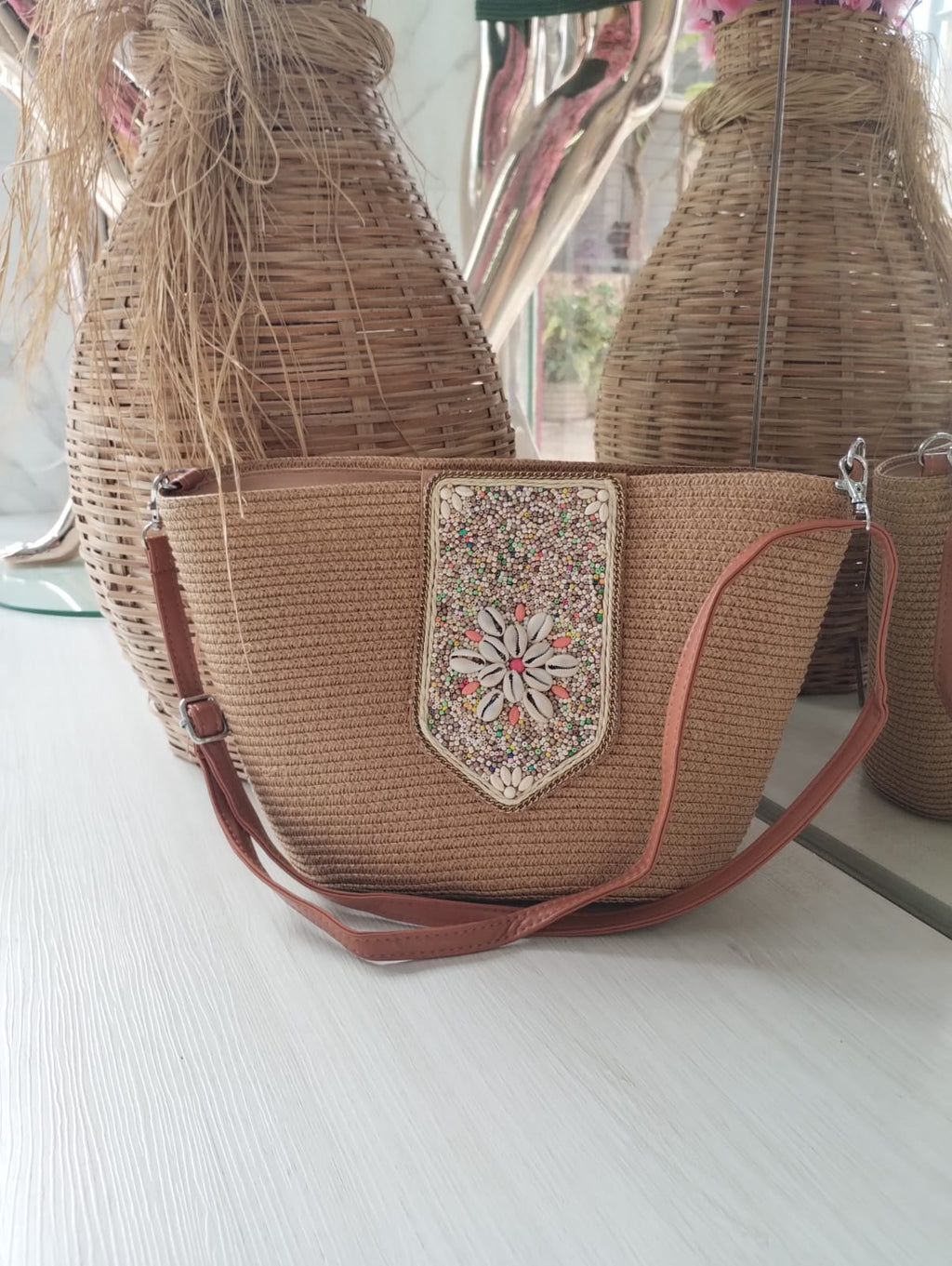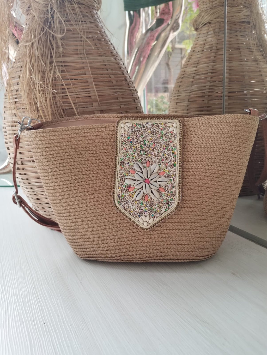 BOLSA DE PRAIA COM MIÇANGAS BEGE