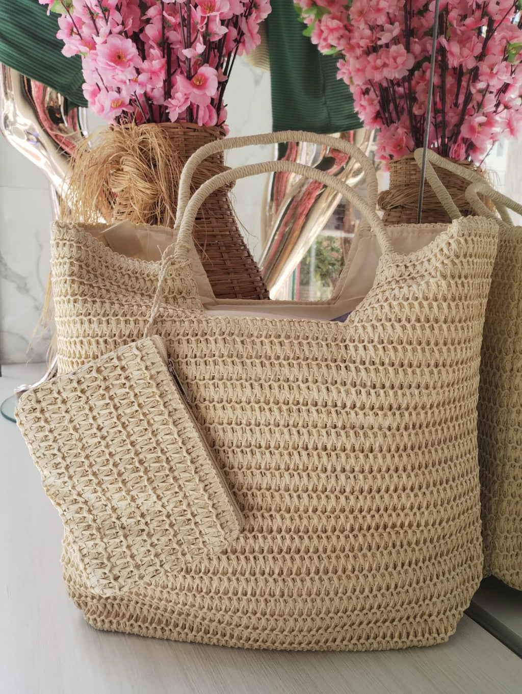 BOLSA DE PRAIA DE MACRAMÊ CREME COM PORTA MOEDAS